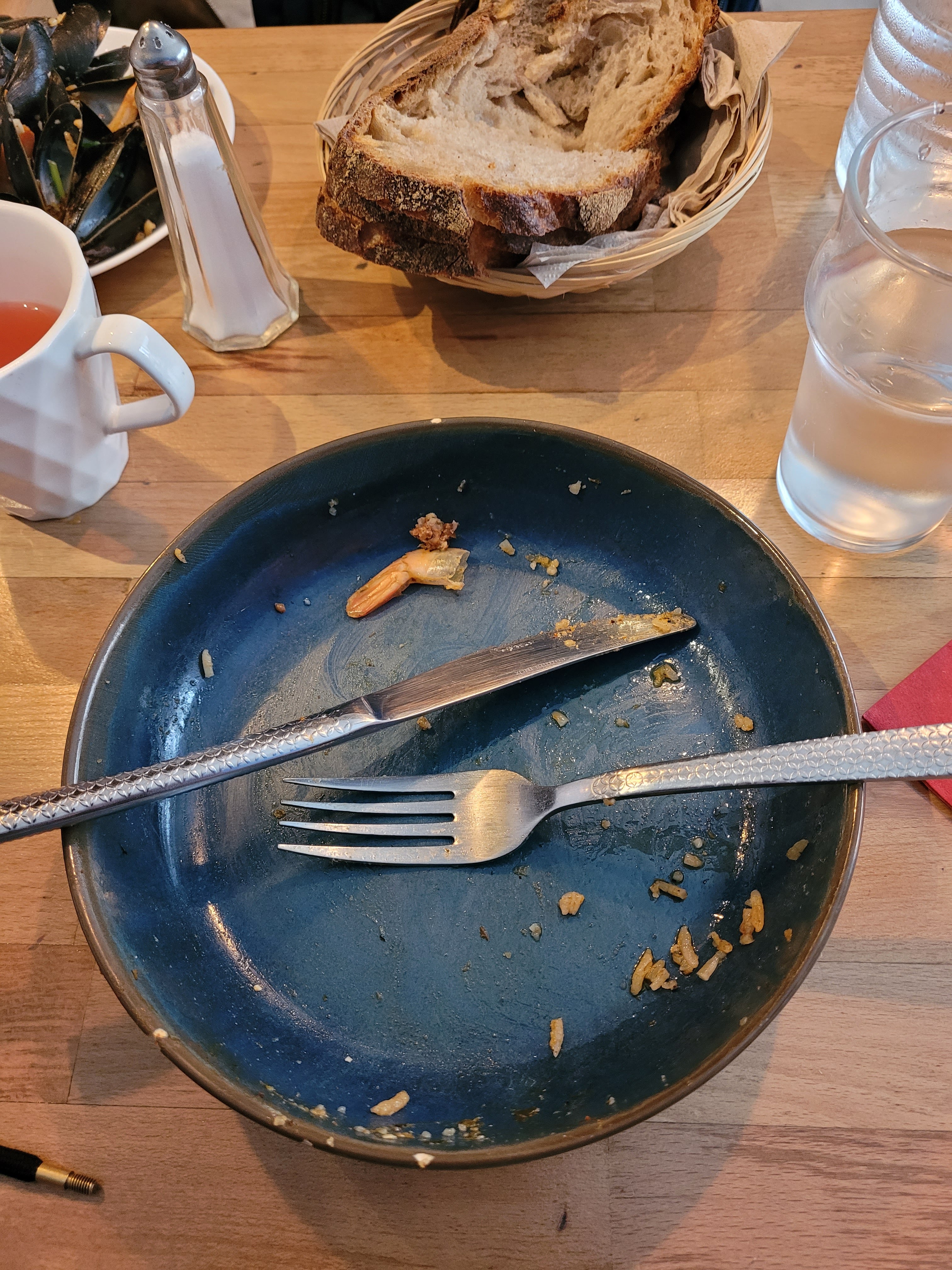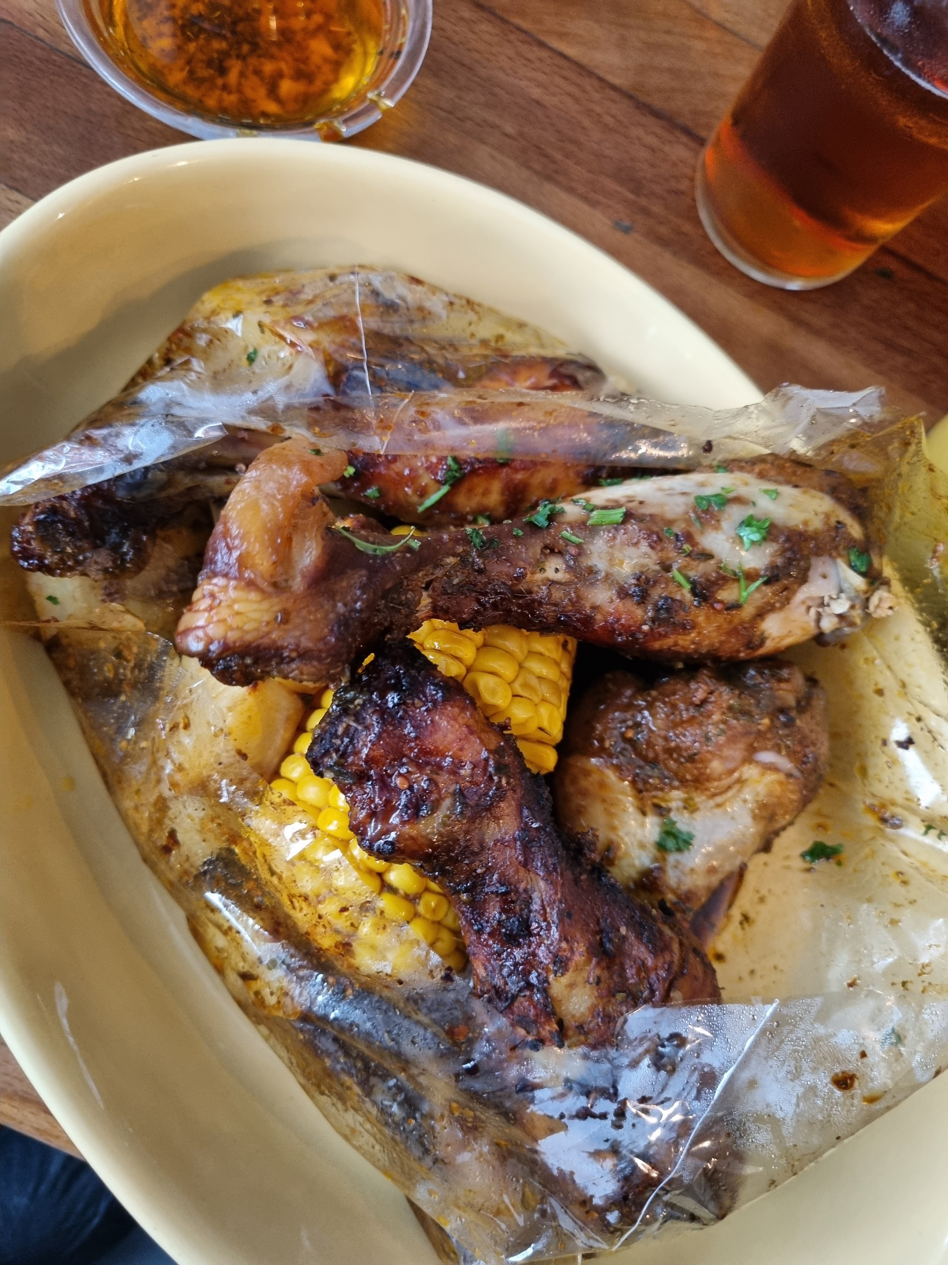 Plutôt déçu également. En effet, la carte des desserts ne nous a pas été proposée, comme si notre avis négatif sur le plat nous avait privés de dessert… Si vous n’acceptez pas la critique, merci de ne pas nous demander notre avis, et surtout de ne pas poser de questions comme « pourquoi ? ». Pourquoi quoi ? C’est simple : le plat ne nous a pas plu, c’est tout. Cette question est vraiment déplacée. Concernant le plat, j’ai pris le Cajun Boil aux crustacés. J’ai tout mangé parce que j’avais très faim, m’étant réservé toute la journée en lisant les avis très élogieux. Je m’attendais à quelque chose d’exceptionnel. Le meilleur élément du plat ? Le maïs… Autant dire que 61 euros pour apprécier un morceau de maïs, c’est cher payé. Les crustacés, pour la plupart, étaient beaucoup trop cuits. Sur cinq langoustines, trois étaient immangeables – réduites à de la bouillie. L’ensemble du plat manquait cruellement de saveur, et seule la petite portion de sauce au beurre (un mélange de beurre, d’ail et de quelques épices) apportait un peu de goût. Mais après deux gambas et un morceau de pomme de terre, il n’y avait déjà plus de sauce. Si vous souhaitez une autre (toute petite) portion de cette sauce, il vous faudra payer 2 euros de plus ! Deux euros pour du beurre et de l’ail, c’est tout simplement ridicule. Il m’aurait fallu demander au moins 4 ou 5 portions supplémentaires pour profiter du plat pleinement. Résultat : j’ai fini par manger sans sauce, et c’était vraiment fade.