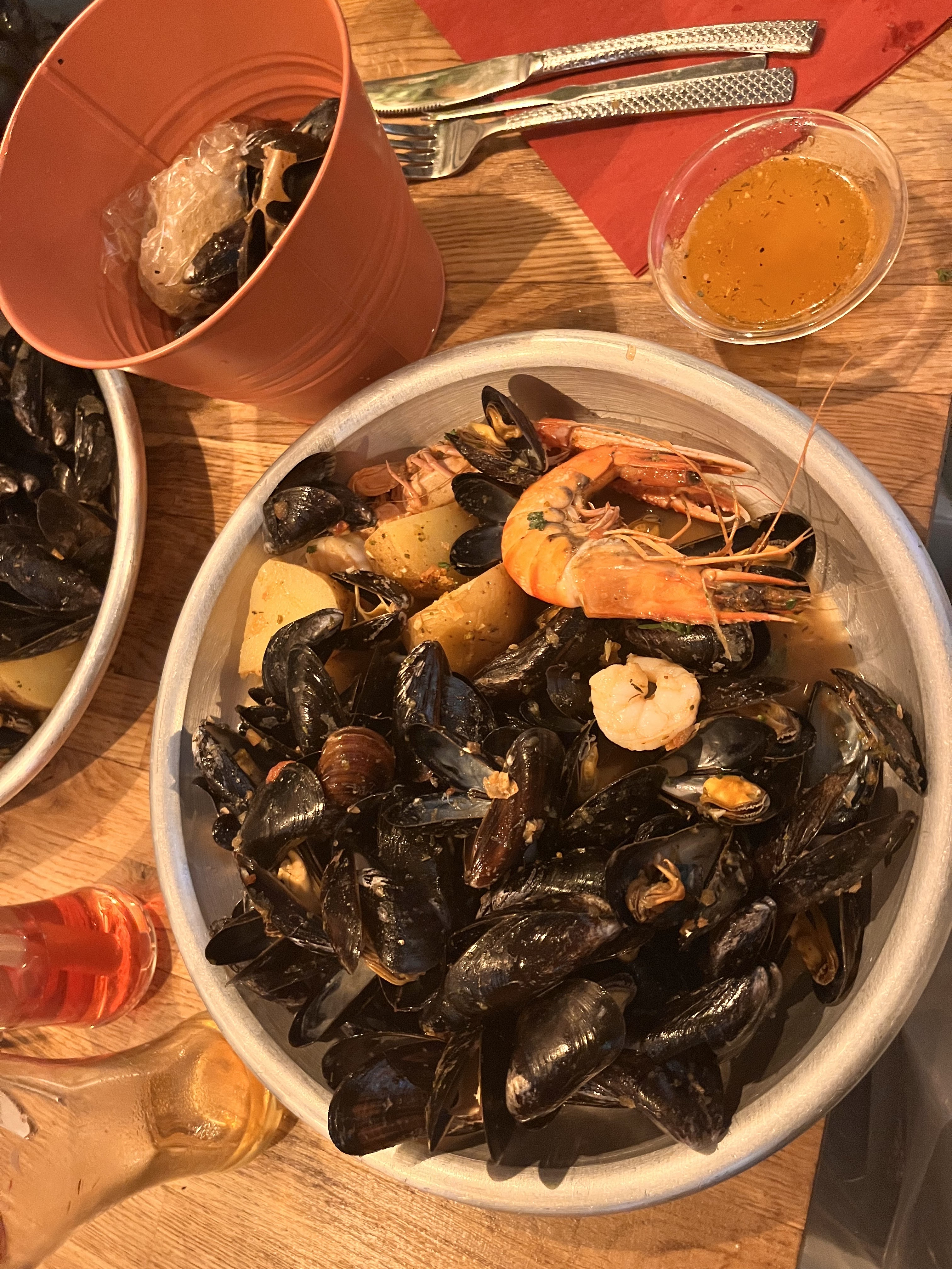 Mon épouse et moi sommes allés pour fêter nos 22 ans de mariage. Nous avons pris le plat le plus cher de la carte 114 € royal.... (Homard.....), après plus de 30mn d'attente dans un brouhaha inqualifiable entretenu durant toute notre présence par un groupe de jeunes gens qui étaient là pour fêter l'anniversaire de l'un des leurs, on nous apporte enfin le plat commandé en papillote en apparence. Mais après avoir mis le tablier et les gants conformément au rituel imposé, notre désenchantement a été total. Les Moules et crustacés étaient froids. Il y avait beaucoup de moules, bref, la fraîcheur et la cuisson des fruits de mer laissent à désirer. Il est possible que le premier service soit mieux que le second. Je tenais juste à partager avec vous mon expérience. Si vous devriez vous y rendre, n'y allez surtout pas en second service.